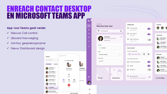 Via de Enreach Contact Desktop heb je één centrale plek voor al je contacten. Je leest en beantwoordt eenvoudig je voicemailberichten, zodat je nooit meer een belangrijk bericht mist. Daarnaast beheer je je bereikbaarheid flexibel: stel zelf in wanneer en hoe je oproepen wilt ontvangen, allemaal binnen één overzichtelijke interface.