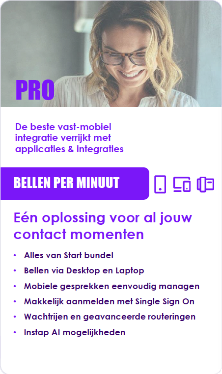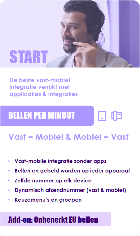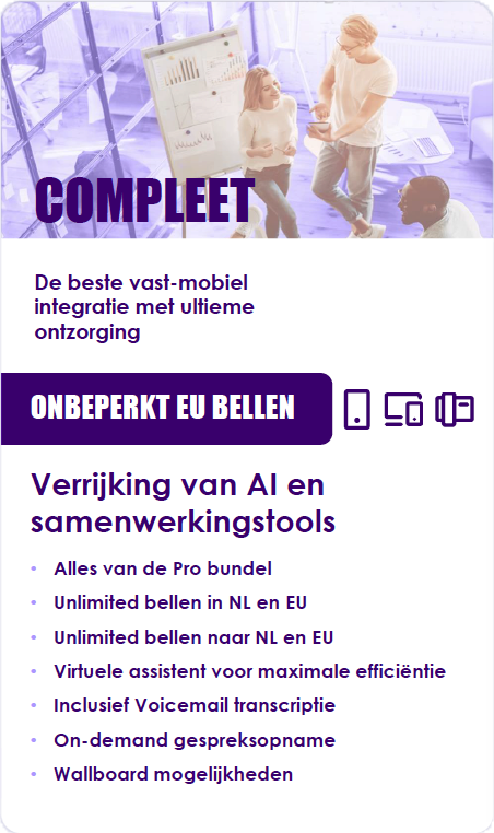 Met onze pakketten – StartPro en Compleet – integreer je vaste en mobiele telefonie met webcommunicatie in één overzichtelijke en schaalbare omgeving. Zo werk je efficiënter, ben je altijd bereikbaar en houd je grip op je communicatiekosten.